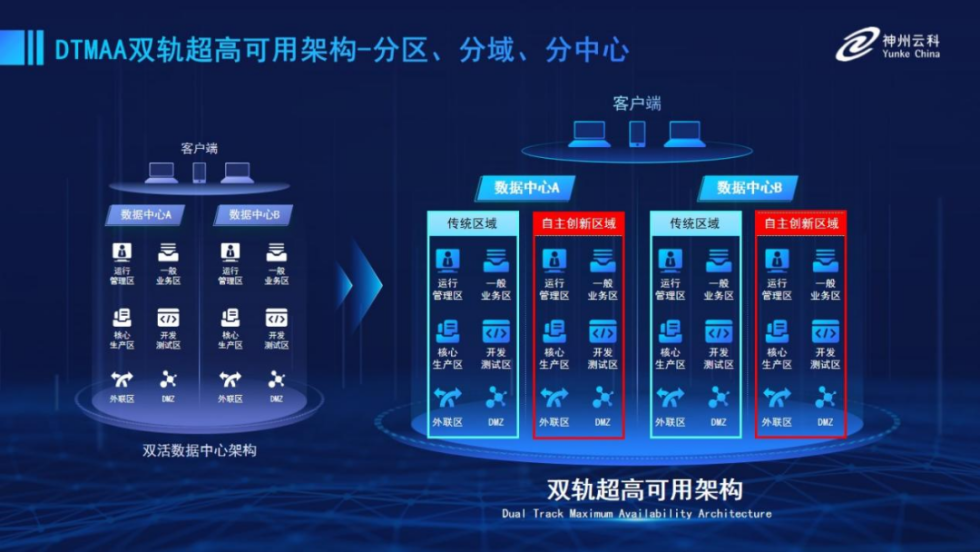 為幫助金融客戶更好地應對數(shù)字經(jīng)濟時代對可持續(xù)性的高要求,實現(xiàn)“信創(chuàng)”與“數(shù)字化”齊頭并進,leyu.樂魚推出了雙軌超高可用架構。該架構在雙活數(shù)據(jù)中心的分區(qū)調(diào)度基礎上,增加信創(chuàng)域和非信創(chuàng)域的分域調(diào)度,實行信創(chuàng)域與傳統(tǒng)域應用全量部署,使雙中心運營變?yōu)殡p中心四區(qū)域并行運行,互為多活,將“0到1”的單軌建設道路變?yōu)榉謪^(qū)分域協(xié)同的多活雙軌超高可用架構。幫助客戶在新架構下,保障“信創(chuàng)”的同時解決性能瓶頸,提升穩(wěn)定性,保證應用可持續(xù)性,最終實現(xiàn)信創(chuàng)區(qū)域和非信創(chuàng)區(qū)域的平滑過渡,完成國產(chǎn)化替代目標。