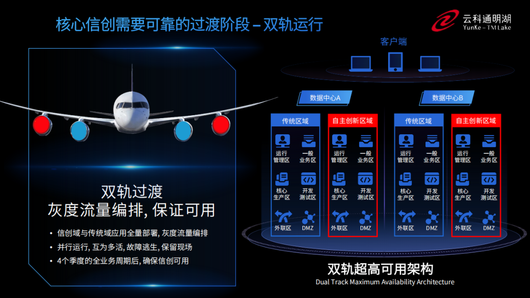 雙軌超高可用架構(gòu)在雙活數(shù)據(jù)中心的分區(qū)調(diào)度基礎(chǔ)上,增加信創(chuàng)域和非信創(chuàng)域的分域調(diào)度,實行信創(chuàng)域與傳統(tǒng)域應(yīng)用全量部署,使雙中心運營變?yōu)殡p中心四區(qū)域并行運行,互為多活,將傳統(tǒng)架構(gòu)變?yōu)榉謪^(qū)分域協(xié)同的多活雙軌超高可用架構(gòu)。幫助客戶在新架構(gòu)下,保障“信創(chuàng)”的同時解決性能瓶頸,提升穩(wěn)定性,保證應(yīng)用可持續(xù)性,最終實現(xiàn)信創(chuàng)區(qū)域和非信創(chuàng)區(qū)域的平滑過渡,完成國產(chǎn)化替代目標(biāo)。