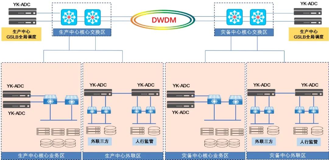 生產中心和災備中心為對稱部署,兩個中心使用波分技術實現(xiàn)互相連接;