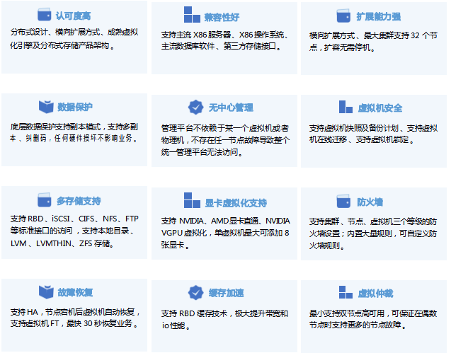 虛擬化場景融合計算和存儲資源,提供具有極簡 、高效 、可靠的虛擬化環(huán)境 。提供 OS 一鍵式交互安裝,支持業(yè)務(wù)的快速上線,靈活擴展 。對各類資源統(tǒng)一管理,按需分配,支持一鍵巡檢 、歷史性能數(shù)據(jù)統(tǒng)一監(jiān)控 。支持第三方虛擬化管理平臺 、CDP 保護平臺 。支持?jǐn)?shù)據(jù)多副本及 EC 技術(shù) ,大幅提升用戶可得容量 。提供多種安全可靠策略 ,HA 高可用 、備份計劃,虛擬機保護,保障業(yè)務(wù)連續(xù) 。