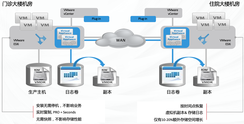 院區(qū)內(nèi)兩個機(jī)房需要協(xié)同保障業(yè)務(wù)連續(xù)性,同時(shí)要能防范因人為誤操作導(dǎo)致 重大損失的災(zāi)難,并能決速恢復(fù)系統(tǒng)。